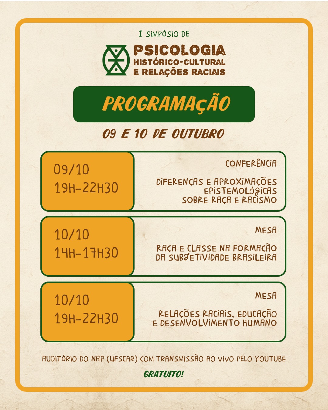 Nos dias 9 e 10 de outubro, acontece na UFSCar e com transmissão ao vivo pelo YouTube o I Simpósio "Psicologia Histórico-Cultural e Relações Raciais".